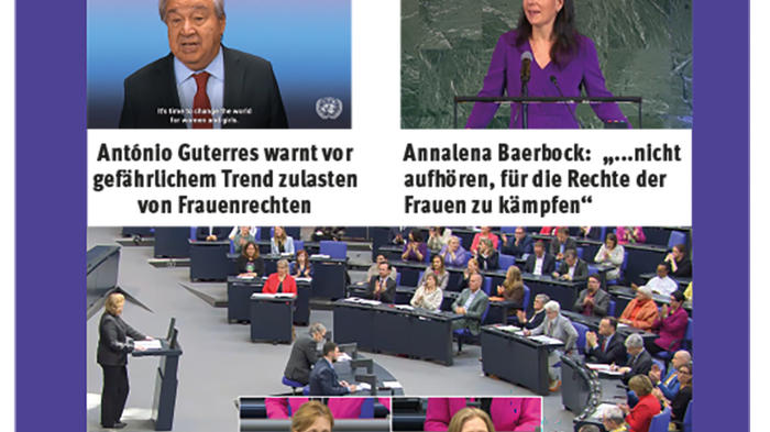 zwd New York (ticker/ig). UN-Generalsekretär António Guterres hat in seiner Botschaft zum Internationalen Frauentag 2026 vor einem „neuen gefährlichen Trend“ zumAutoritarismus und vor neuenBestrebungen gewarnt, Frauenrechte zunichte zu machen. Auf ihrer 68. Sitzung hat die UN-Frauenrechtskommission mit 37 von 44 stimmberechtigten Staaten eine Resolution zur Sicherung von Frauenrechten durch die Justiz und den Abbau diskriminierender Gesetze verabschiedet, die auch von Bundesfrauenministerin Karin Prien unterstützt wurde. Rednerin war auf der UN-Sitzung war auch die Präsidentin der UN-Vollversammlung Annalena Baerbock. mehr...