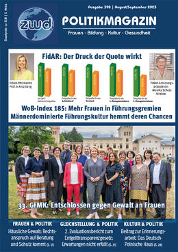 RedaktionIn dieser Ausgabe ziehen wir eine Bilanz der frauenpolitischen Konferenzen dieses Sommers. Die Titelgeschichte gilt der Entwicklung der Frauenteilhabe an Führungspositionen, dem Kampf gegen die häusliche Gewalt und der unbefriedigenden Situation bei den Bemühungen um die Herstellung von Transparenz bei der Entgeltgleichheit. Ferner geht es um das deutsch-Polnische Haus und die Ausstellung "Secessionen" in Berlin.