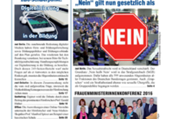 Außerdem in dieser Ausgabe: Digitalisierung in den Ländern: Auf dem Weg zur „Bildung 4.0“ Exzellenzinitiative: Langes Ringen um den Kompromiss Medien: 200 bayerische SchülerInnen gingen vier Wochen lang offline zwd-Autor Prof. Gerald Hüther: „Eine Generalkritik an digitalen Medien ist nicht weiterführend“ Novellierungen: Filmförderungsgesetz und Kulturgutschutzgesetz CDU/CSU-Kultursalon unter der Reichstagskuppel: „Kultur öffnet Welten. Wir schaffen das!“