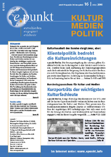 zwd Berlin. In der Woche vom 15. bis 19. März wird der Bundestag in zweiter und dritter Lesung den Bundeshaushalt verabschieden. Anlass für das neue zwd-Supplement e.punkt, sich mit dem Haushalt des Bundesbeauftragten für Kultur und Medien zu beschäftigen. Mit e.punkt für KULTUR, MEDIEN und POLITIK erweitern wir im zwd-Magazin BILDUNG. GESELLSCHAFT UND POLITIK unser Berichterstattungsspektrum auf die Kulturpolitik in Bund, Ländern sowie den europäischen Kulturinstitutionen. Die nächste Ausgabe erscheint im Mai 2010. Das Thema: Auswärtige Kulturpolitik.