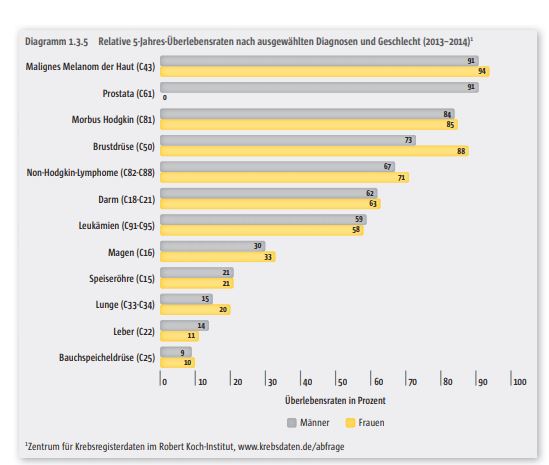 Die krebsbedingte Sterblichkeit unterscheidet sich bei Frauen als auch bei Männern je nach Diagnose teils enorm. Während beide Geschlechter bei Hautkrebs, Lymphdrüsenkrebs (Morbus Hodgkin und Non-Hodgkin), Darmkrebs und Leukämien relativ hohe Überlebensprognosen von über 58 Prozent aufweisen, liegen die Werte bei Magen-, Speiseröhren-, Lungen-, Leber- und Bauchspeicheldrüsenkrebs bei unter 33 Prozent.