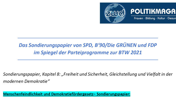 Die Arbeitsgruppe aus Politiker:innen von SPD, B'90/DIE GRÜNEN und FDP, die ein ca. 3-seitiges Papier zum Themenkomplex "Gleichstellung, Vielfalt" für die Ampel-Koalitionsverhandlungen vorbereiten soll, hat viele zentrale Gegensätze zu klären. Während zwischen SPD und Grünen über Fragen wie Parität, Quote oder Ehegattensplitting weitgehen Übereinkunft besteht, wird es schwer sein, von den Liberalen Zugeständnisse zu bekommen. Möglicherweise müssen andere AGs (Moderner Staat, Bürgerrechte) dazu beitragen. Schon bei der Verteilung der Minister:innen-Posten im künftigen Kabinett, die nach dem Willen des SPD-Kanzlerkandidaten Olaf Scholz geschlechterparitätisch erfolgen soll, hat die FDP-Spitze abgewinkt. mehr...