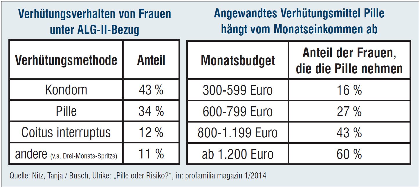 Aus Kostengründen verhüten Frauen, die Sozialleistungen beziehen, seltener als Frauen mit mittlerem oder höherem Einkommen und sind somit dem Risiko einer ungewollten Schwangerschaft stärker ausgesetzt. Kondome werden bei ALG-II-Bezug (33,3 %) häufiger benutzt als bei mittlerer finanzieller Lage (22,7 %). Von den Frauen dieser Einkommensgruppe nehmen 48,5 Prozent die Pille, von den ALG-II-Bezieherinnen nur 36,7 Prozent. 13,3 Prozent von ihnen wählen die (unwiderrufliche) Verhütungsmethode Sterilisation, während nur 6,3 Prozent der Frauen mit mittlerem Einkommen sich für diese entscheiden. Das belegt die Soziologin Prof.´in Dr. Cornelia Helfferich in der von ihr geleiteten und Ende 2017 erschienenen Studie „frauen leben 3“, die im Auftrag der Bundeszentrale für gesundheitliche Aufklärung (BZgA) durchgeführt wurde. Abweichende Ergebnisse wurden in der Studie von Prof.’in Ulrike Busch und Tanja Nitz ermittelt (siehe Tabelle).
