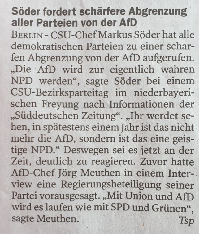 "Die AfD wird zur eigentlich wahren NPD werden." Diese Äußerung des bayerischen Ministerpräsidenten Markus Söder (CSU) war der Tagesspiegel-Politikredaktion keine Schlagzeile, sondern lediglich eine 17-Zeilen-Meldung wert.