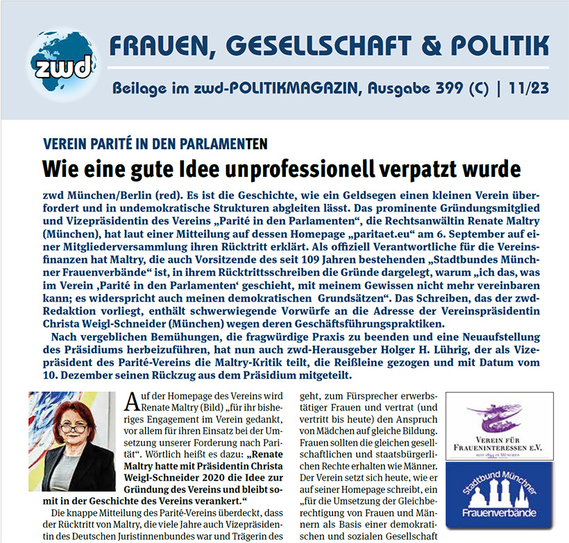 Die Probleme des Vereins „Paritè in den Parlamenten“ wie auch die Tatsache, dass die Kampagne trotz umfassender Postcode-Lotterie in diesem Jahr zum Erliegen gekommen ist, haben sich schon länger abgezeichnet. Bereits im Frühjahr hatte das Gründungsmitglied, die Vorsitzende des Stadtbundes Münchner Frauenverbände, Rechtsanwältin Renate Maltry, im Hinblick auf Ihre Zuständigkeit als Vizepräsidentin für Finanzen ihren Rücktritt erklärt. Maltry hat vor der Mitgliederversammlung des Vereins am 5. September 2023 brieflich die Gründe dargelegt, warum „ich das, was im Verein ‚Parité in den Parlamenten‘ geschieht, mit meinem Gewissen nicht mehr vereinbaren kann; es widerspricht auch meinen demokratischen Grundsätzen“. Das Schreiben, das der zwd-Redaktion vorliegt, enthält schwerwiegende Vorwürfe an die Adresse der Vereinspräsidentin Christa Weigl-Schneider wegen deren Geschäftsführungspraktiken sowie zur Verwendung von rd. 400.00 Euro Fördermitteln der PostCode-Lotterie. Schon 2021 hatte eine andere Vizepräsidentin wegen ähnlicher Kritik an der Präsidentin ihren Rücktritt aus dem Präsidium erklärt. Die Führungspraxis blieb unverändert.