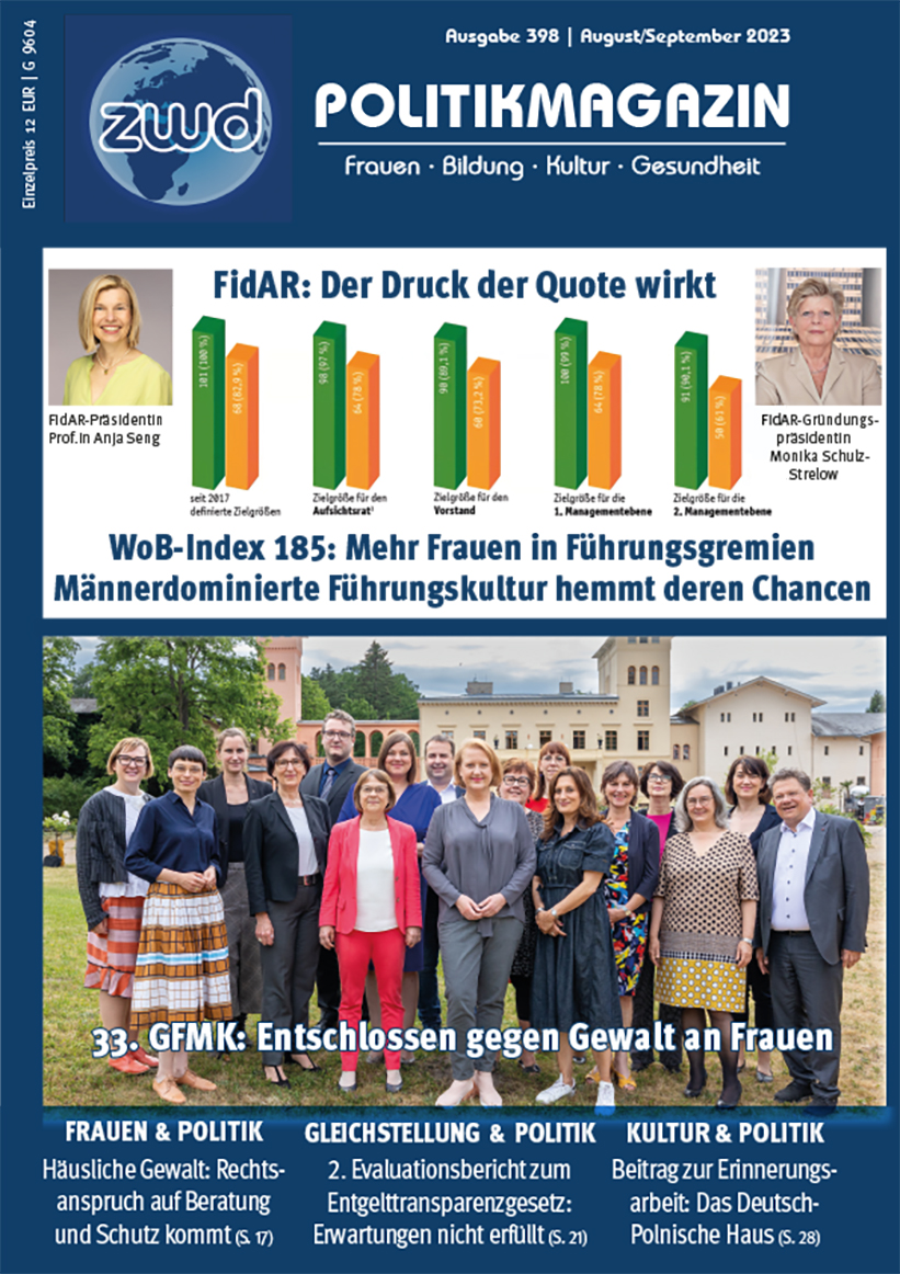 Die frauenpolitischen Themen des Sommers: Frauen in Führungspositionen, Häusliche Gewalt, Entgeltungleichheit : Ausgabe 398 steht zum Download zur Verfügung
