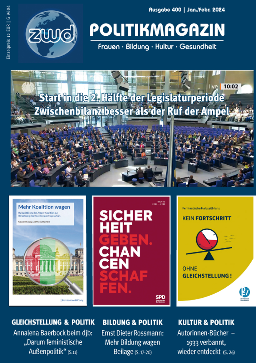 In der aktuellen Ausgabe des zwd-POLITIKMAGAZINs geht es um die Koalitionsbildung in Berlin, um das Startchancenptrogramm und das Wissenschaftszeitvertragsgesetz. Im frauenpolitischen Fokus stehen die Nachlese zum Weltfrauentag 2023 und die Wahlrechtsreform. Titelthema der gedruckten und digitalen Ausgabe 396 sind die Leitlinien zur feministischen Außen- und Entwicklungspolitik.