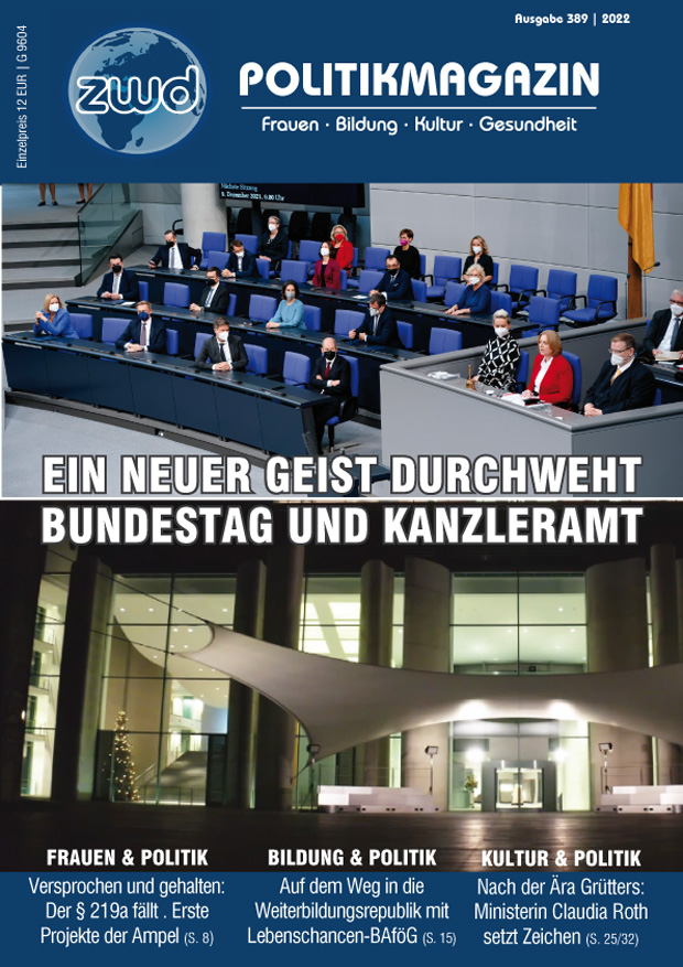 Diese Ausgabe des zwd-POLITIKMAGAZINs Nr. 389 beleuchtet die ersten 50 Tage der neuen Bundeskoalition von SPD, Grünen und FDP. Erste Konturen des versprochenen Aufbruchs lassen sich erkennen, aber gewaltige Aufgabenfelder müssen erst noch bestellt werden. Unsere Kernthemen: Kommt die Weiterbildungsrepublik? Wird der Kampf gegen die Altersarmut, die vor allem Frauen betrifft, aufgenommen? Wieweit kommen junge Abgeordnete bei der Vergabe von wichtige Positionen zum Zuge?