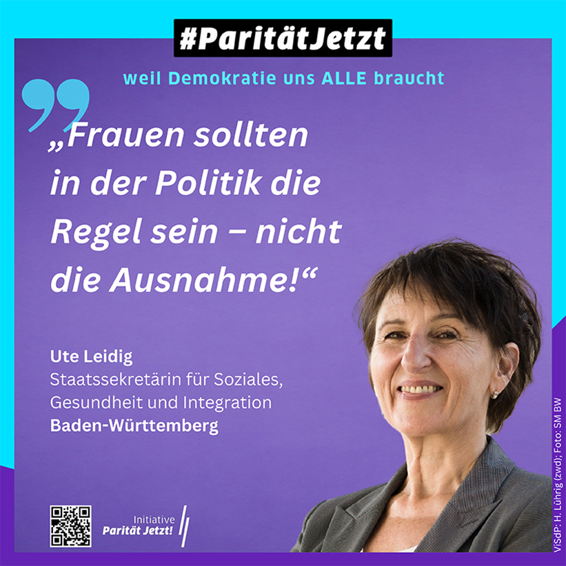 Die GRÜNEN-Politikerin Dr.in Ute Leidig gehört seit Februar 2019 dem baden-württembergischen Landtag an und konnte ihr Direktmandat im Wahlkreis Karlsruhe bei der Landtagswahl 2021 erfolgreich verteidigen. Im Kabinett Kretschmann III ist die promovierte Sozialpsychologin seit Mai 2021 Staatssekretärin. Die Gleichstellungspolitik ist Leidig laut ihrer Webseite (www.ute-leidig.de) ein Kernanliegen. Am 6. April 2022 hat der Landtag eine Landtagswahlrechtsreform verabschiedet (Erst- und Zweitstimme, aber noch keine Parität).