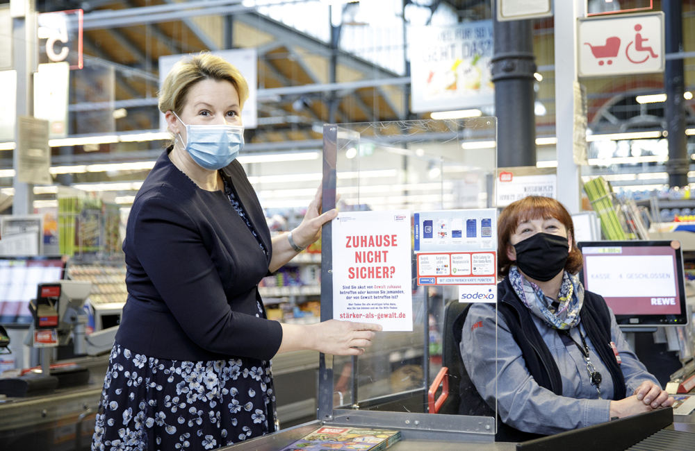 In Zusammenarbeit mit den großen Supermarkt-Ketten, wie Aldi, Lidl oder EDEKA, hat sich die vom Bundesfamilien-ministerium (BMFSFJ) aufgelegte Initiative „Stärker als Gewalt“ das Ziel gesetzt, Menschen zu unterstützen, die während der aktuellen Corona-Krise entweder selbst häusliche Gewalt erfahren oder im Falle beobachteter oder miterlebter Gewalttaten helfend eingreifen wollen. In bundesweit rund 26.000 Einkaufsmärkten werden im Kassenbereich, an Eingängen und Anzeigen-Brettern Plakate aufgehängt, welche über die Initiative des BMFSFJ und wichtige Hilfsangebote informieren.