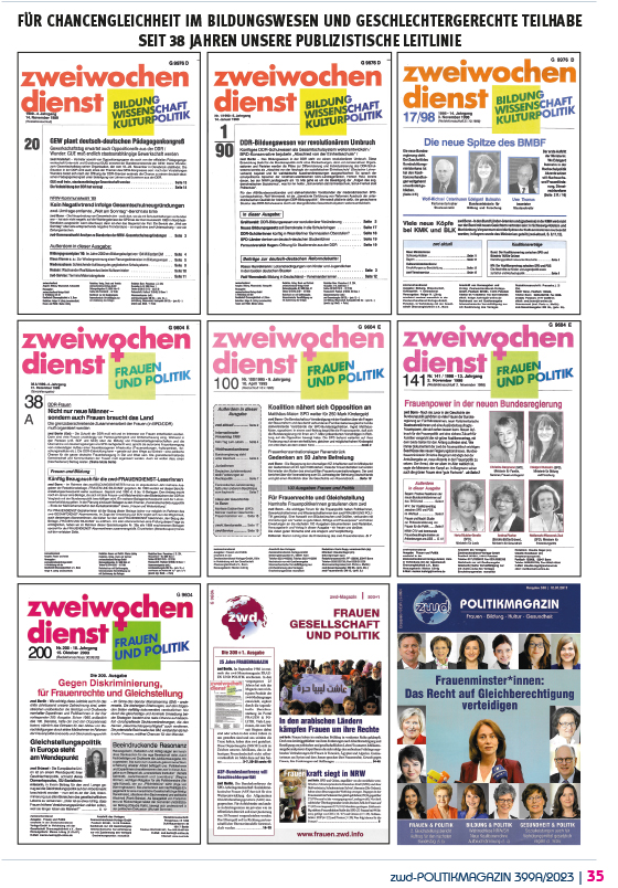 Bei dem Informationsdienst „zwd FRAUEN UND POLITIK“, dessen Nummerierung wir beim zwd-POLITIKMAGAZIN fortgesetzt haben, ist unser Credo (bis heute) leichter durchzuhalten als beim bildungspolitischen Dienst. Denn Frauen- und Gleichstellungspolitik stehen immer noch nur selten im Fokus der Tages- und Wochenzeitungen. Wir sehen: Die Zusammenführung beider Dienste ab 2014 im „zwd-POLITIKMAGAZIN“ ist in der Leserschaft positiv angenommen worden. Und unser inhaltliches Credo, unser publizistisches Engagement für Chancengleichheit und paritätische Teilhabe, für Gleichstellung, soziale Gerechtigkeit und Geschlechtergerechtigkeit gilt unverändert.