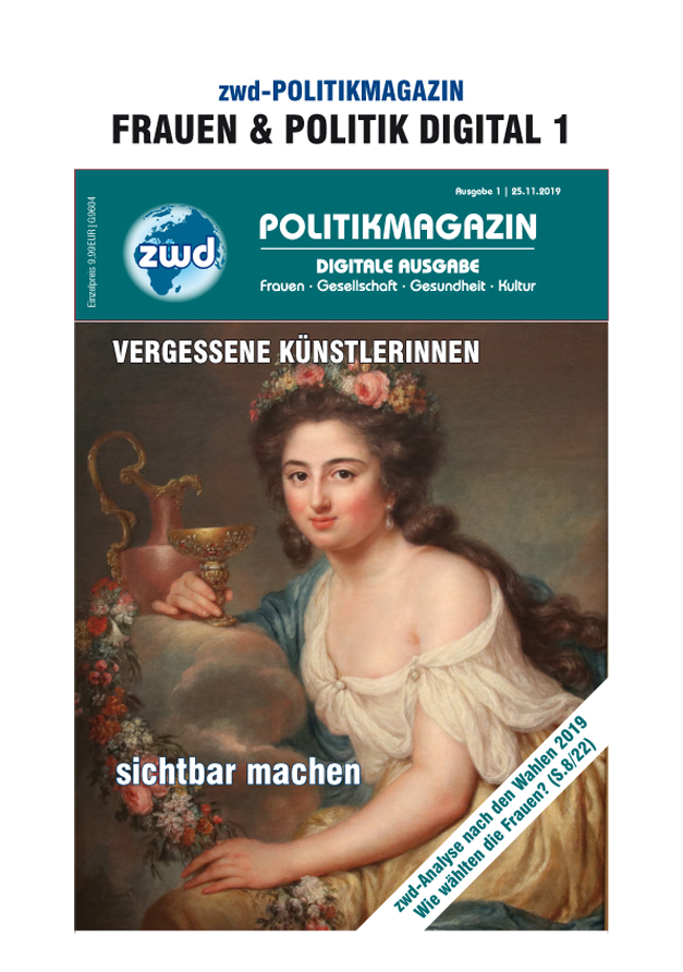 Titelgeschichte gilt vergessenen Künstlerinnen. zwd-Chefredakteurin Hilda Lührig-Nockemann berichtet nicht nur über die Ausstellung in der Alten Nationalgalerie Berlin ("Kampf um Sichtbarkeit"), sondern schreibt auch über die wenigen Jahre der Künstlerinnen des Bauhauses, die heute zumeist im Schatten ihrer männlichen Kollegen stehen. zwd-Herausgeber Holger H. Lührig lädt schließlich zur öffentlichen Debatte ein: Was Politik kann tun, damit Künstlerinnen sichtbar werden und bleiben. Ein weiterer Schwerpunkt unserer Ausgabe beschäftigt sich mit den Landtagswahlen dieses Jahres in Brandenburg, Sachsen und Thüringen. In allen Parlamenten ist der Frauenanteil unter den Parlamentarier*innen rückläufig. Das Rechercheergebnis unseres Redaktionsmitglieds Julia Trippo: Frauen wählten weniger konservativ. Besonders pikant: Der Koalitionsvertrag in Brandenburg der Parteien SPD, CDU und Grüne trägt frauenpolitisch eine eher rot-grüne Handschrift. Doch aus dem Namen des von der Grünen-Politikerin Ursula Nonnenmacher geleiteten Ministeriums ist der Ressortname "Frauen" verbannt, anders als zu Zeiten der unvergessenen Frauen- und Sozialministerin Regine Hildebrandt (SPD). Mit einem Blick nach Europa haben wir das Wahlverhalten der Frauen und Männern bei den Ende Mai stattgefundenen Wahlen des Europäischen Parlaments analysiert. Besonders auffällig ist, dass deutlich mehr Männer die AfD gewählt haben. Hinsichtlich der Neubesetzung der Kommission beleuchteten wir das neue Team von Kommissionchefin Ursula von der Leyen. Ihr selbstgestecktes Ziel einer geschlechterparitätischen Kommission konnte sie nicht erreichen. Auch die Gewerkschaftstage der IG Metall und ver.di im Herbst haben wir begleitet und einen genaueren Blick auf deren neue gleichstellungspolitische Beschlüsse geworfen und diese dokumentiert. Darin werden auch die Gewerkschaftsgremien selbst in die Pflicht genommen. Wir wünschen Ihnen eine schöne und nicht minder spannende Adventszeit. Die zwd-Redaktion wünscht Ihnen eine spannende Lektüre! Sie können die aktuelle Ausgabe im PDF-Format hier herunterladen. Noch kein*e Abonnent*in? Eine Übersicht unserer Abo-Modelle finden Sie hier.