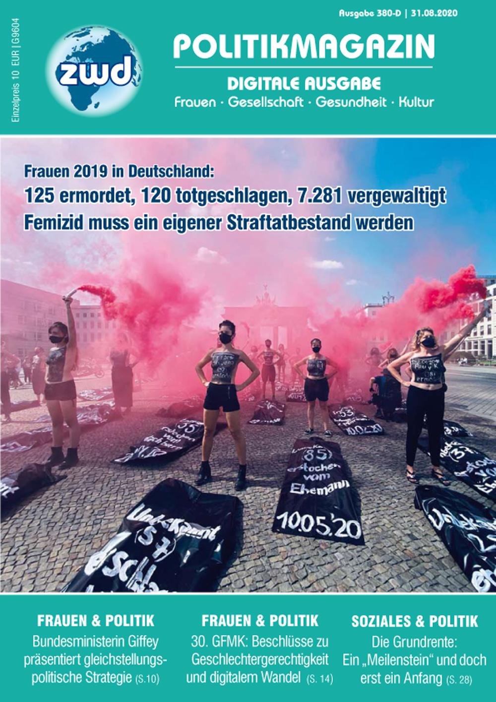 Der Kernauftrag der Istanbul-Konvention ist unverstanden zwd Berlin. Am 15. August 2020 ließen sich ca. 50 mutige Frauen, unterschiedlichen Alters und internationaler Prägung, jeweils die Todesanzeige eines deutschen Femizid-Opfers auf ihre Brustkörper malen. Jede dieser Frauen trug zudem symbolisch ein weiteres deutsches Femizid-Opfer qua Leichensack zum Brandenburger Tor – und symbolisch zu Grabe. Das alles, um die 125 Frauen zu ehren, die männliche Gewaltexzesse im laufenden Jahr 2020 mit ihrem Leben bezahlen mussten. Die Aktion richtet sich an die vier verantwortlichen Minister*innen der Bundesregierung, denen die Protestlerinnen Weigerung vorwerfen, die Istanbul-Konvention – das Abkommen des Europarats zur Bekämpfung und Verhütung von Gewalt gegen Frauen und häuslicher Gewalt – zweieinhalb Jahre nach Inkrafttreten in Deutschland endlich umzusetzen. Eine der Initiatorinnen der Berliner Aktion, Prof. Dr. Kristina Wolff , hat dazu für das zwd-POLITIKMAGAZIN einen Gastbeitrag verfasst. ab Seite 6 GEWALT GEGEN FRAUEN - GASTBEITRAG KATJA GRIEGER