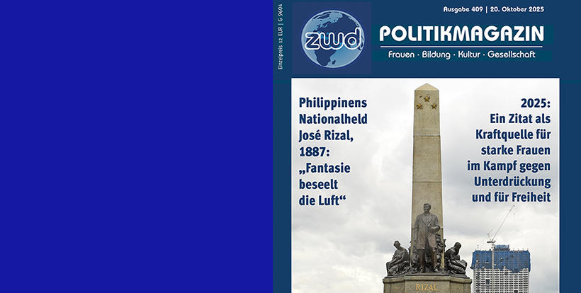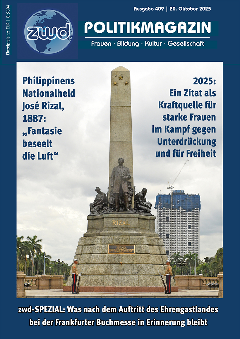 "Fantasie beseelt die Luft“ - Was sagte uns das Leitmotto der Philippinen, Ehrengastland der Buchmesse 2025? Wenn diese Ausgabe gedruckt die Briefkästen unserer Leserschaft erreicht, ist die Frankfurter Buchmesse 2025 bereits schon wieder Geschichte. Mit unserer Berichterstattung über Ehrengastländer der Buchmesse war und ist es uns seit vielen Jahren traditionell wichtig, gerade jene Themen aus bildungs- und frauen- sowie gleichstellungspolitischem Blickwinkel zu beleuchten, die vor und während der Messe in den gedruckten Medien selten Platz gefunden haben. Das gilt auch für das Ehrengastland der diesjährigen Frankfurter Buchmesse, die Philippinen, das in Anlehnung an seinen Nationalhelden Josè Rizal dessen Motto ausgewählt hatte: „Fantasie beseelt die Luft“. Kann uns damit etwas verbinden? Es steht als Anspruch und Kraftquelle für den Kampf starker Frauen, auch als Autorinnen, gegen die Unterdrückung und für Freiheit. Unsere Fragestellung zielt jeweils über die Zeit der Buchmessen-Präsentation hinaus. Sie will nicht nur den Blick auf das Gastland schärfen, sondern auch hinterfragen, welche Erfahrungen und Lernprozesse sich daraus für uns eröffnen können. (Seite 3)